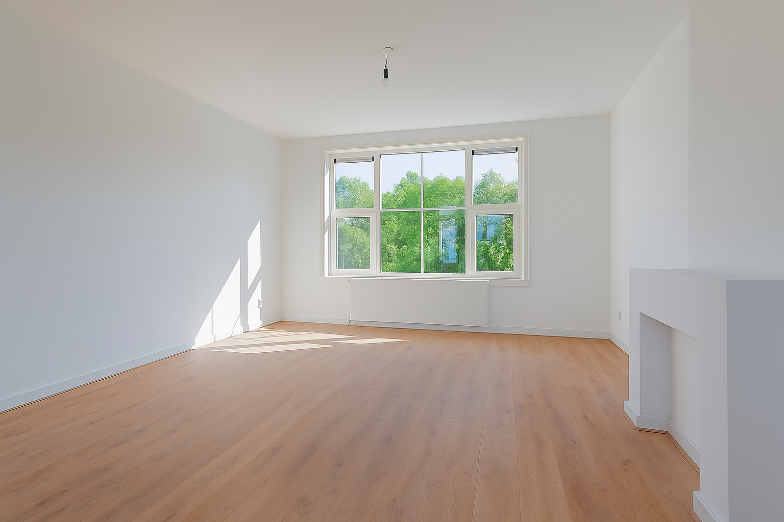 De woonkamer aan de voorzijde is verrassend licht dankzij de brede raampartijen en kijkt vrij uit over het parkje. De combinatie van de lichte laminaatvloer en de strak afgewerkte wanden geeft de ruimte een moderne en rustige uitstraling.