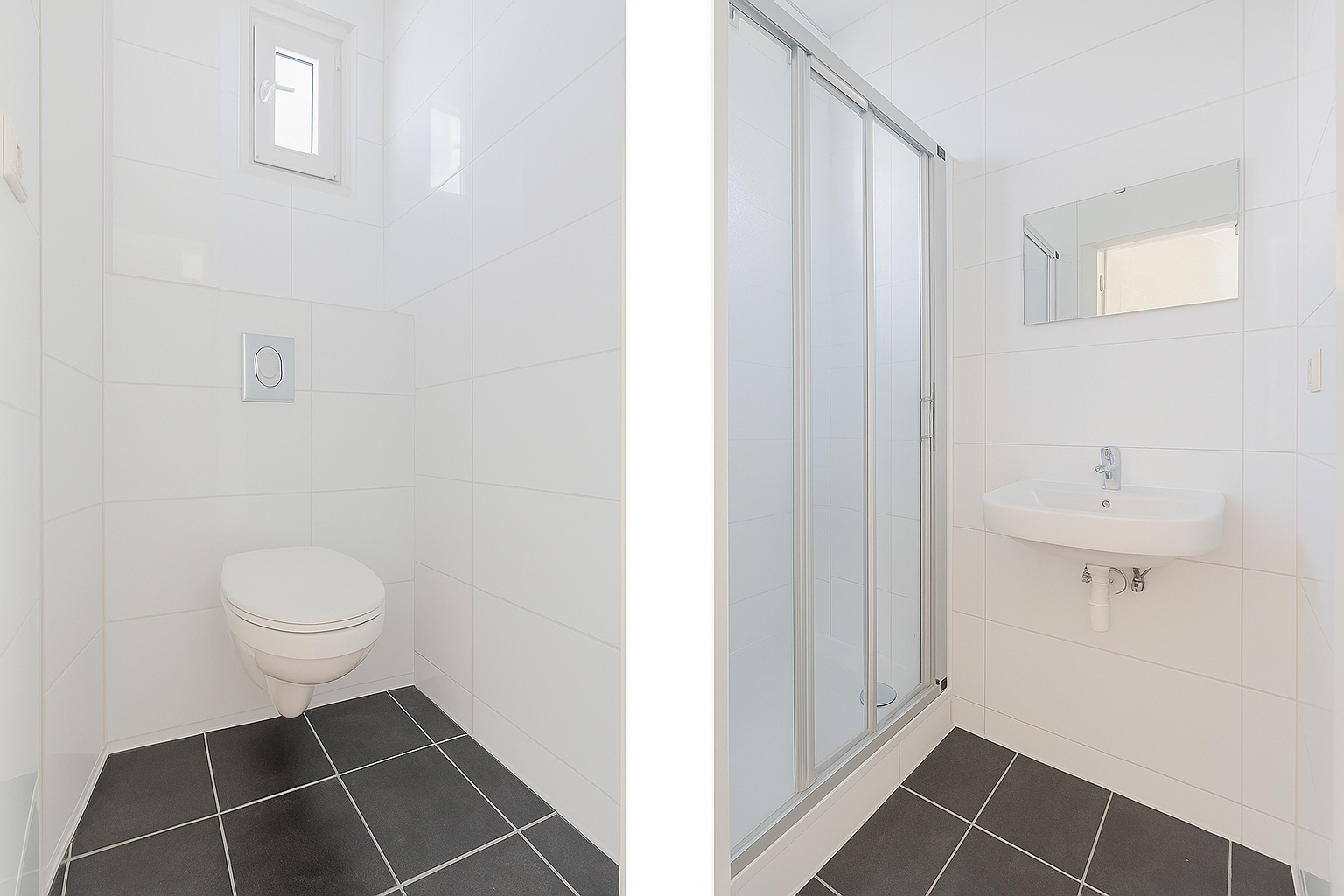 De badkamer is in 2022 gerenoveerd en voorzien van een douchecabine en een wastafel met meubel. Het toilet is separaat en eveneens strak uitgevoerd.